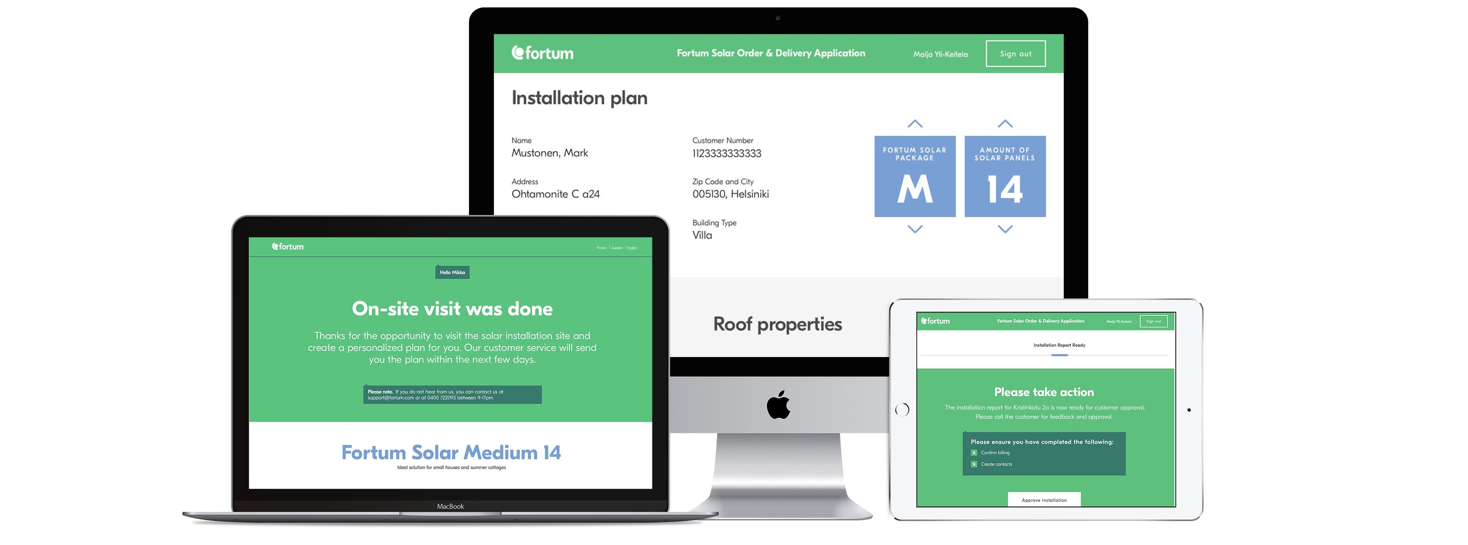Buying solar panels is the easy part. Getting them properly installed — coordinating between the customer, Fortum's support team, and a third-party installer — is where the experience typically breaks down. We designed Fortum SODA to fix that. SODA is a single online service that adapts to three distinct user groups. Customers see the status of their order and know exactly what happens next. Fortum's customer service staff have a live view of every order and know which actions are needed to move things forward. Installers can log the specifics of each job, including any on-site issues they encounter and how they resolved them. The system was designed and validated together with all three groups. Every screen, every notification, every state of the order was tested with real users — not assumed. The result was a service that removed uncertainty from every step of the process, and gave each stakeholder only what they needed to see.