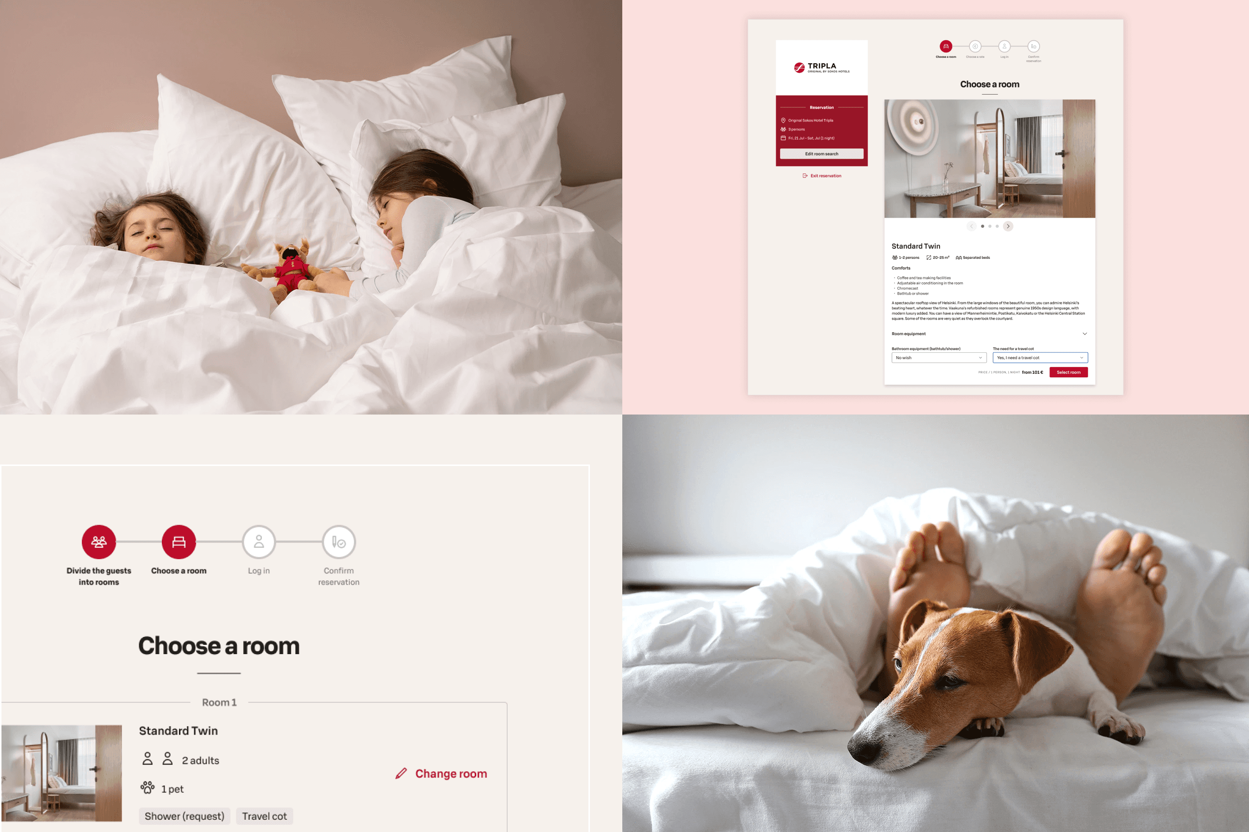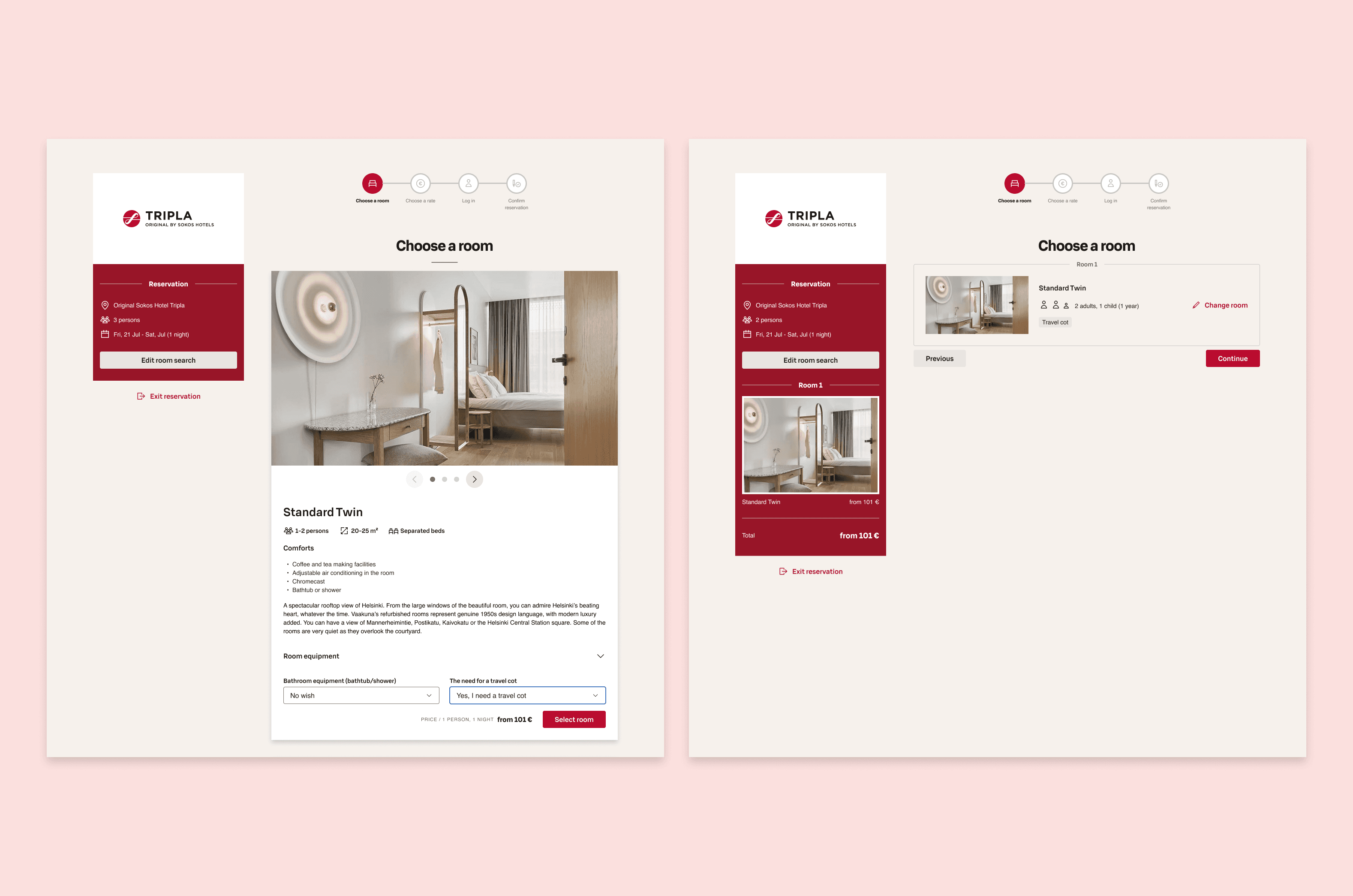 The first thing we did was align with Sokos Hotels on what success actually looked like. Not in abstract terms — in specific ones: what does the booking flow need to do, where does it currently fail, and what does good look like for each type of guest? We worked directly with the product owner, developers, and QA team from the start. Daily collaboration, not weekly check-ins. That rhythm meant we could share research insights quickly, run design reviews that were actually useful, and keep the product moving without accumulating misalignment that would have to be unwound later. From wireframes through MVP rollout to continuous refinements, we shaped the design scope to fit both the ambition and the timeline. We also brought a mix of quantitative and qualitative analytics into the process — tracking what the data showed about where users were getting stuck, and validating design directions through multiple rounds of testing with real hotel guests and loyalty members.