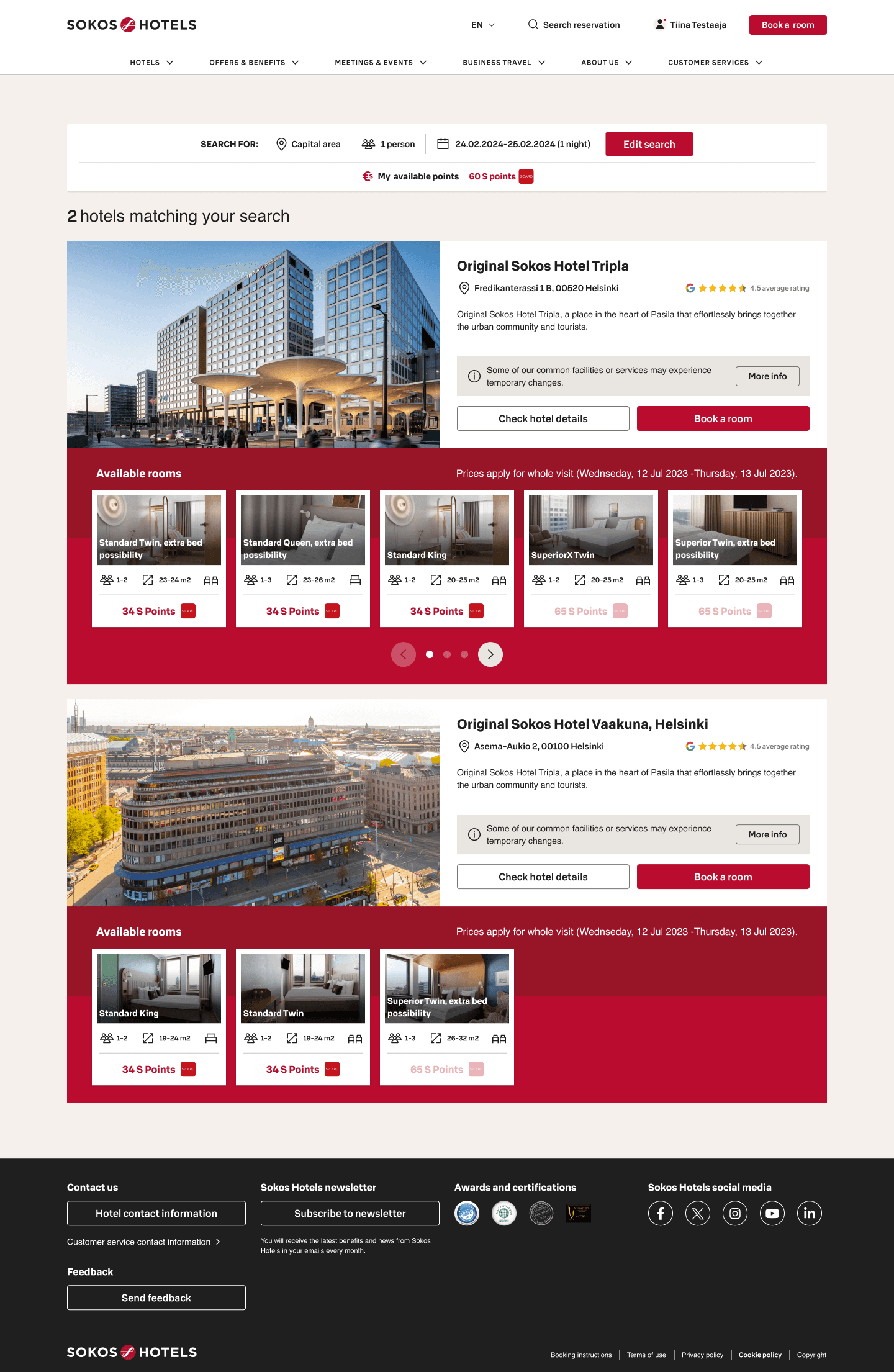 The redesigned Sokoshotels.fi launched and outperformed its predecessor on every metric that mattered to the business. Revenue grew by 20% against 2023's results. Room sales increased by 16%. Conversion rate improved by 40%. The Customer Effort Score — how easily guests can find what they need and complete a booking — reached 4.5 out of 5. Those numbers came from design decisions that were grounded in evidence. We knew where the old site was losing people. We knew which steps in the booking flow created hesitation. Multi-room reservations, loyalty reward redemptions, itinerary edits — these were the moments where the old platform fell apart. The new one handles them in a single, coherent flow. We also invested in the foundation. Working alongside S-Group's Design System team, we built a tailored local library for Sokos Hotels — ensuring visual consistency across all properties while giving the product team components they could actually use without workarounds.